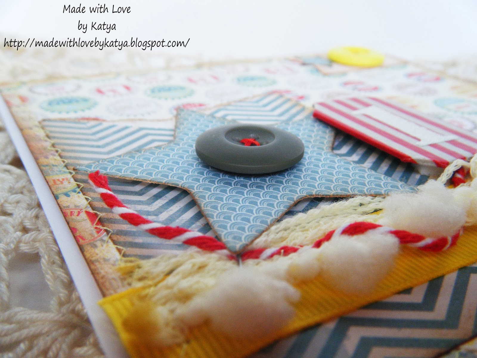 Мне кажется что у меня не умышленно получилась открытка в американском стиле =)) Бумага Papermania Happy Days, пуговицы, нитки для вязания, вырубку, чипборд, твайн, бумажный скотч, ленточка и наклейка-цифра 1.